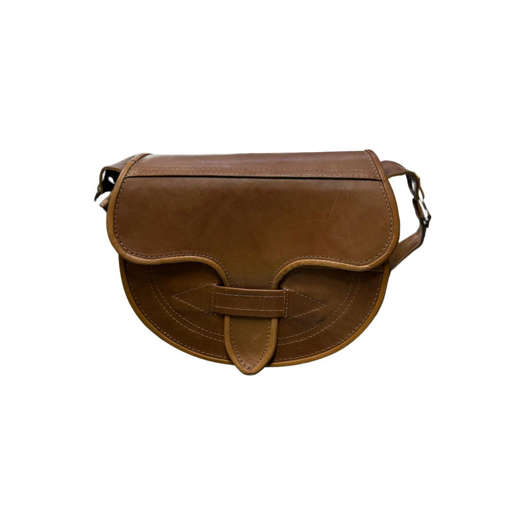 Carriel elaborado en cuero natural, con múltiples bolsillos, correa.